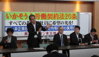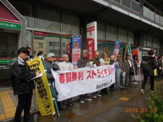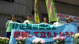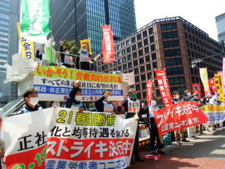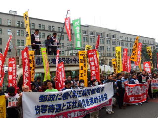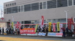 集会は、集団訴訟の原告を代表して3人の非正規労働者が訴え、共同代表の郵政倉敷労働組合井本委員長からのメッセージを紹介しました。要請事項である@更新3年でアソシエイト社員、アソシエイト社員から2年で希望する社員全員を正社員へ採用(登用)することA公正・公平な登用と登用数の拡大B最低賃金を全国どこでも1200円以上へC夏期・冬期休暇は正社員と同様になどとともに、病気休暇の有給化、一時金などの諸手当や福利厚生面での格差是正など諸要求実現に向けて21春闘を意気高くたたかいましょう。